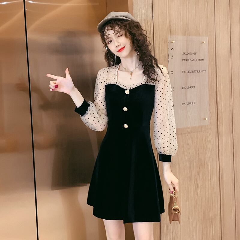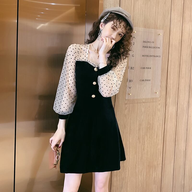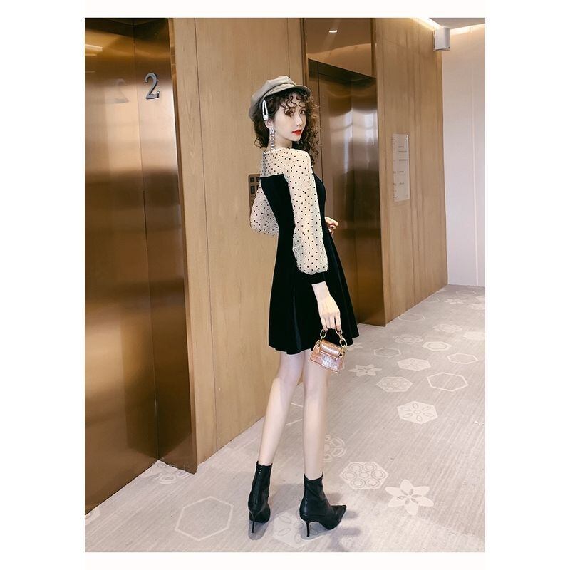ワンピース ドレス ヘップバーン風 カジュアル Aラインワンピース 結婚式 二次会 パーティ レトロ ドット柄 シンプル 長袖 シフォン fsk1581