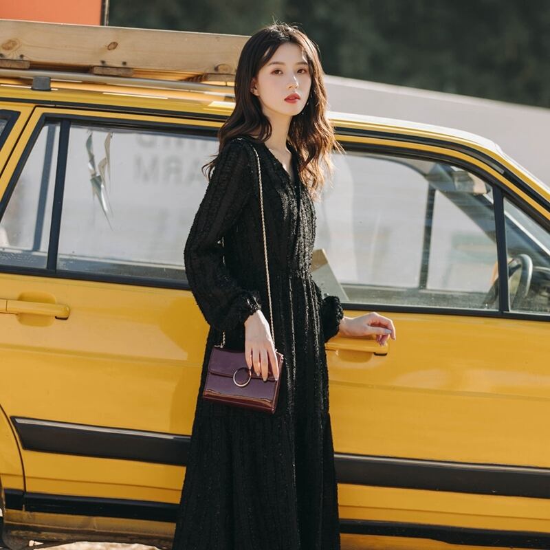 ワンピース ドレス シフォン エレガント カジュアル Vネック 長袖 膝丈 ハイウエスト Aライン デート パーティ レース フレア fsk1617