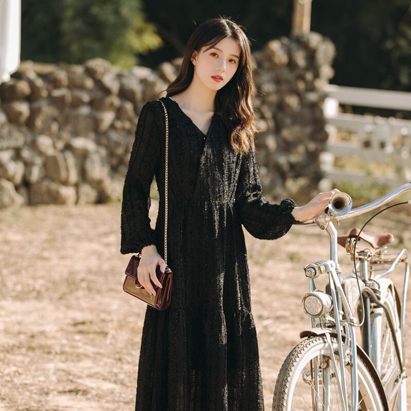 ワンピース ドレス シフォン エレガント カジュアル Vネック 長袖 膝丈 ハイウエスト Aライン デート パーティ レース フレア