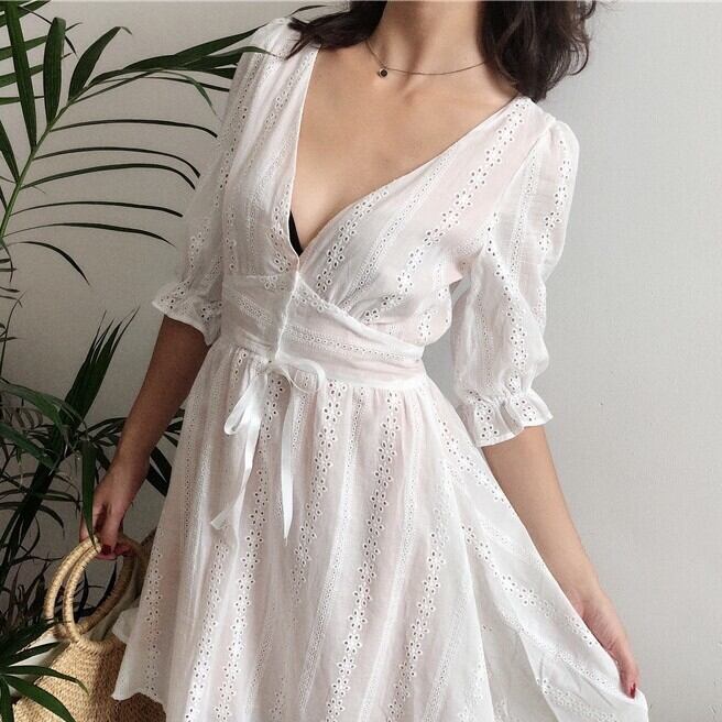 真っ白な刺繍ミニワンピースは、南欧の雰囲気を醸し出してくれます♡Vネックでミニ丈なのでスッキリ着こなしていただけます!ガーリーなワンピースはブーツなどで外していただけると甘すぎないコーディネートを実現できます♡