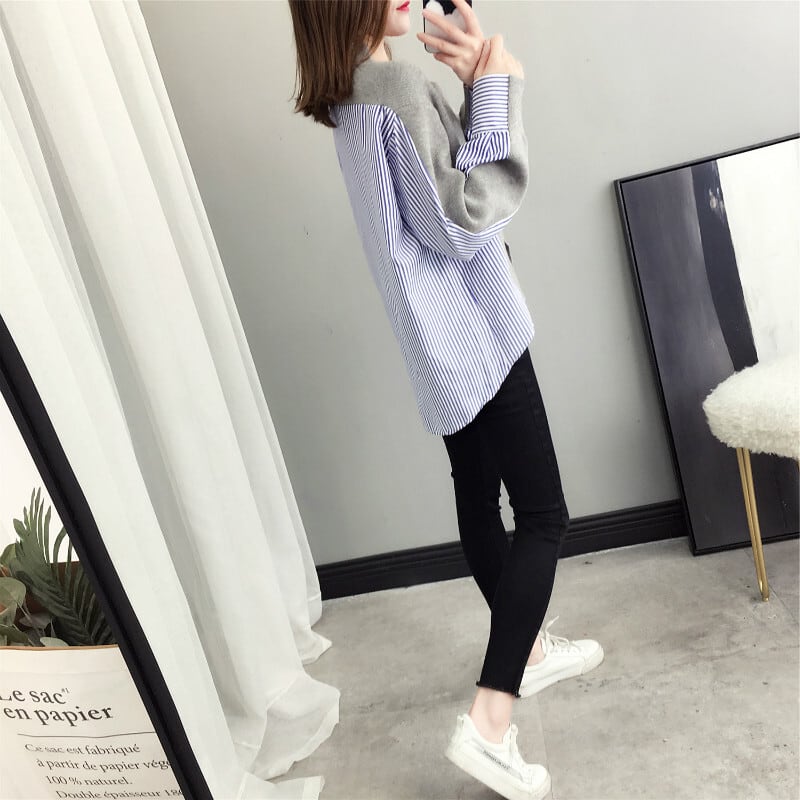シャツニット ドッキングカーディガン ストライプシャツ ニット バイカラー ドッキング 異素材ミックス Vネック ストライプ ゆったり ボリューム カジュアル オフィススタイル モード