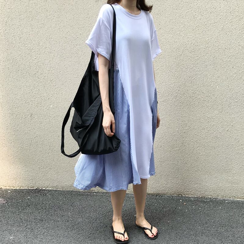 ドッキングワンピース シャツ ストライプ コットン 半袖 Tシャツ 切り替えし バイカラー フレアスカート ミディアム丈 ハイウエスト 夏 カジュアル fsk1701