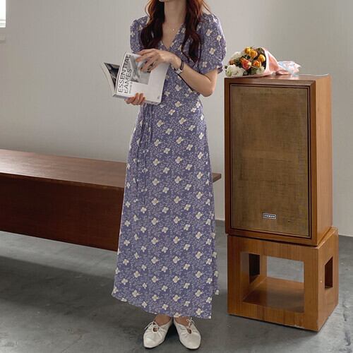 カシュクールタイプのワンピース。スッキリシルエットに袖山ギャザーを入れたパフスリーブでエレガントなイメージに!単色風の花柄プリントで大人っぽく上品さが際立つワンピースです。女子力UP間違いなし!