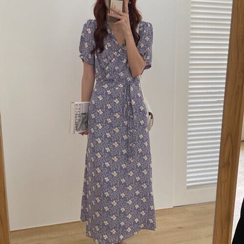 ワンピース 花柄 Vネック 半袖 パフスリーブ カシュクール ウエスト細リボン ほっそりシルエット エレガント ボタニカル袖口タック 上品 デート 涼し気 fsk1744