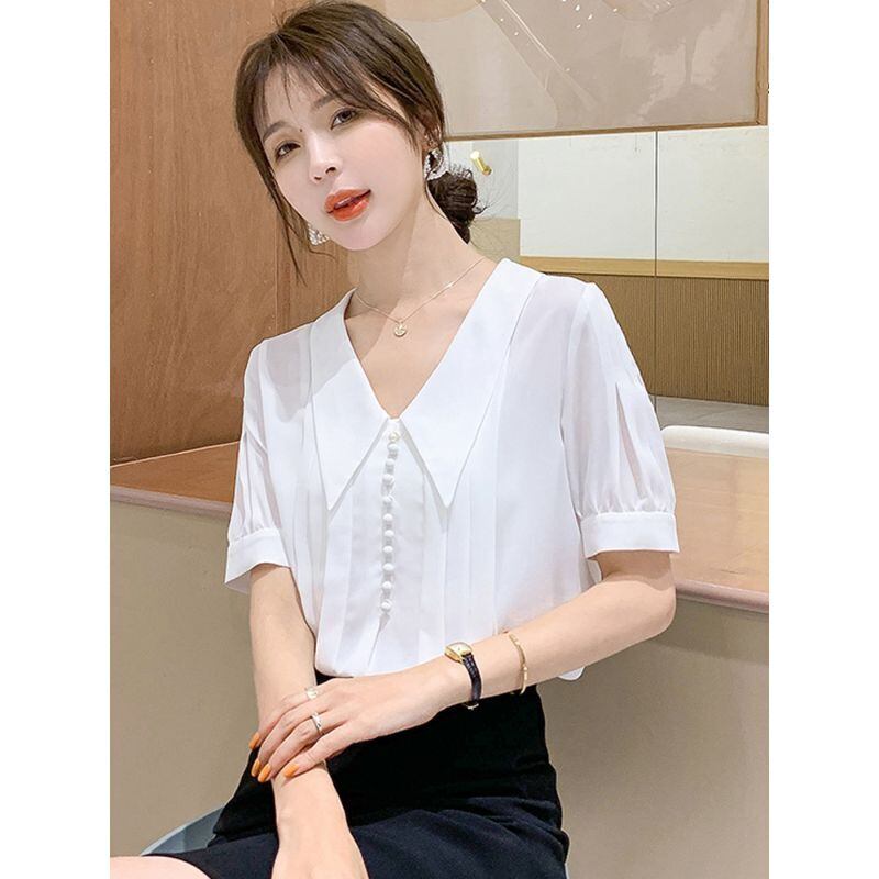 大き目の襟が特徴的なシフォンブラウスです。ボリューミーなパフスリーブとVネックが女性らしい印象に◎