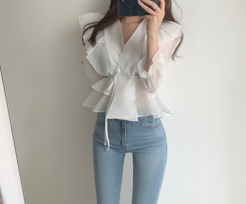 フリルとペプラムを生かした甘めキュートなブラウス。細めパンツと合わせれば大人エレガントなコーディネイトに!