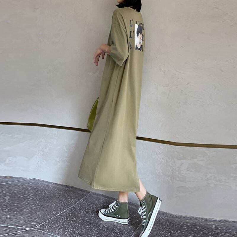 ワンピース ロング Tシャツ オーバーサイズ ゆったり 丸首 五分袖 スリット プリント バックプリント ワンポイント カッコイイ タウン