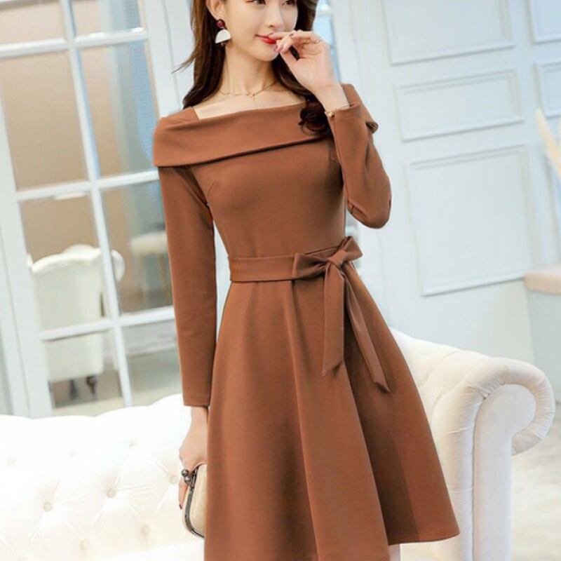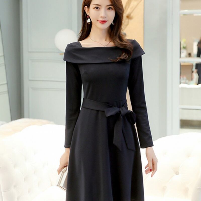 ワンピース Aライン フレアー ミディアム 膝丈 長袖 スクエアーネック ウエスト切り替え ウエストリボン パーティー エレガント 清楚 シック fsk1857