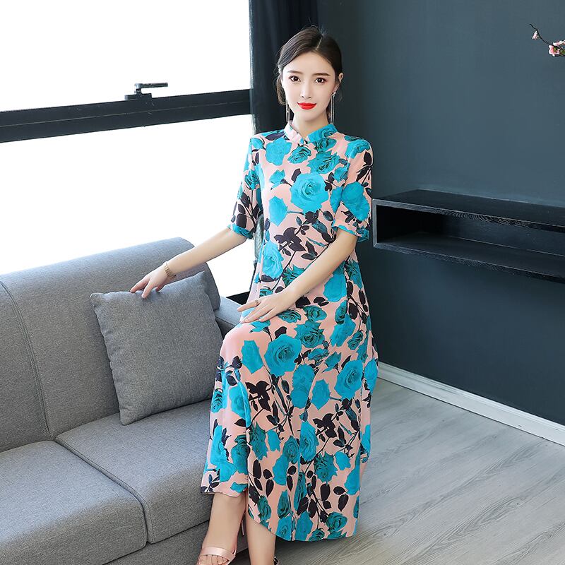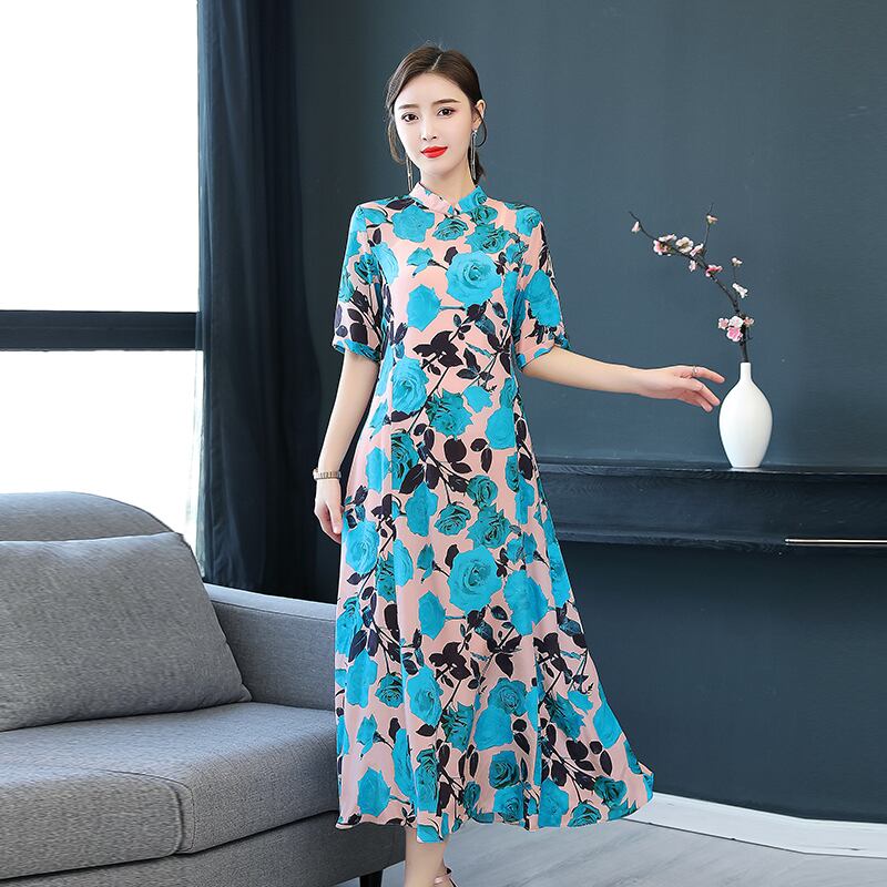 ワンピース ロング Aライン フレアー 半袖 長め半袖 ハイネック 花柄 エレガント パーティー きれいカラー 上品 大人女性 fsk1864