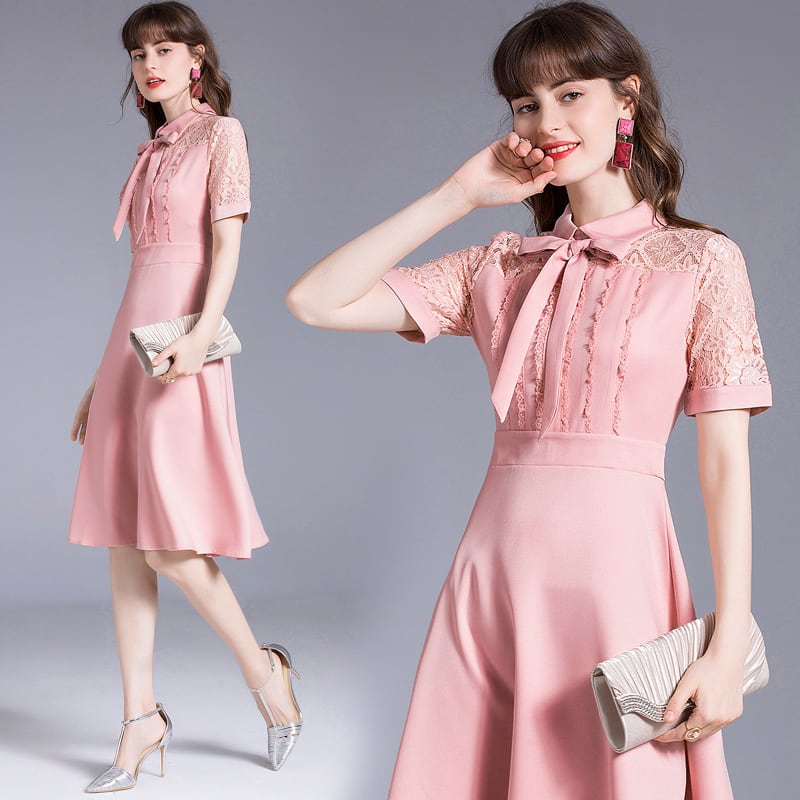 ワンピース Aライン フレアー レース 透け感 ボウタイ 半袖 ひざ上丈 ミディアム ショールカラー ウエストマーク ハイウエスト エレガント 清楚系 パーティー