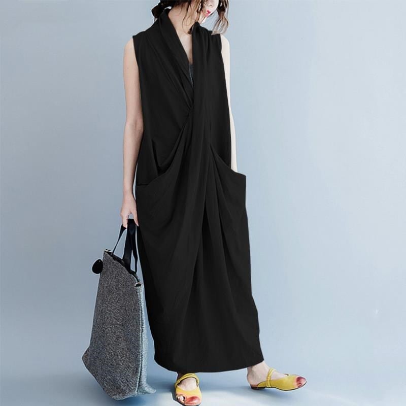ノースリーブでゆったり感覚のマキシ丈ワンピース。左右をクロスしたようなデザインで個性的!サンダル組み合わせでカジュアルにアンニュイな着こなしに!