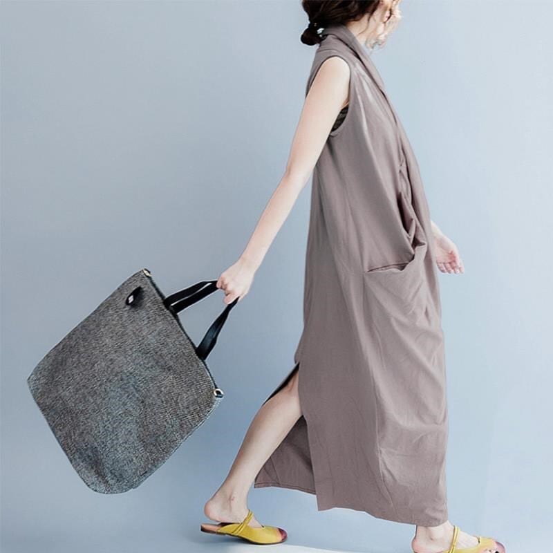 ワンピース ゆったり ロング マキシ Vネック ショールカラー クロス ポケット ノースリーブ カジュアル ラフ スリット