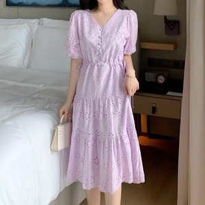 ワンピース フレア ロング レディース マキシ ミディアム ミニ レース Vネック シフォン パフスリーブ ガーリー 白 fsk1881