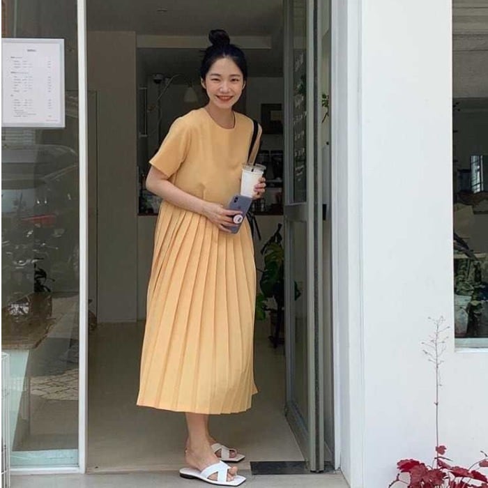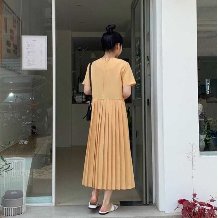 プリーツスカートとTシャツをウエストでドッキングさせたワンピース。1枚でサマになるデザイン性。カジュアルにも少しきれい目にも着こなせます。