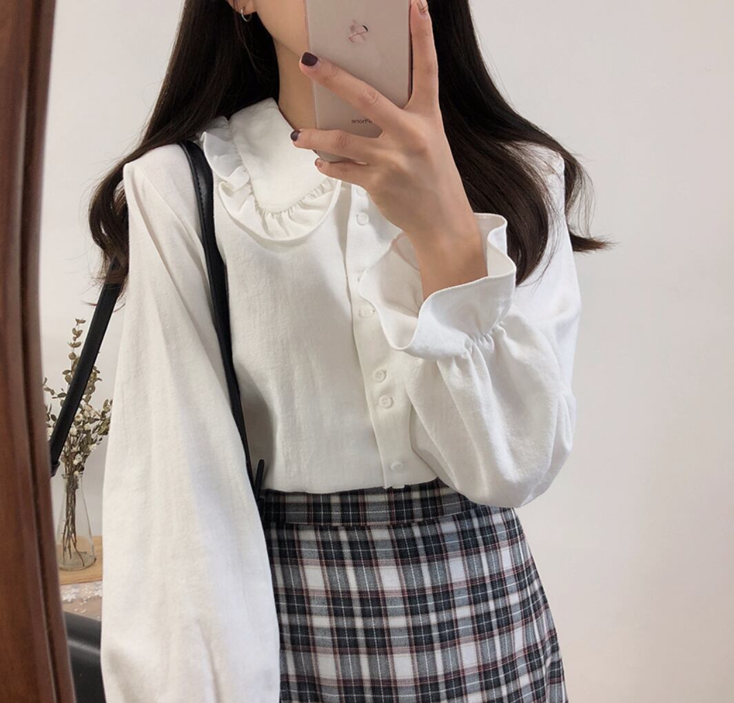 個性的 トップス ブラウス 白シャツ 袖あり 長袖 ボリューム袖 パフスリーブ Uネック 襟付き 細身 ストレート フリル かわいい 大人可愛い きれいめ シンプル カジュアル 大人 上品 おしゃれ お洒落 レトロ 大人可愛い 大人女子 ラフ ラブリー キュート ガーリー 無地 春 夏 秋 冬 オールシーズン シーズンレス 10代 20代 30代 オフィス ビジネス OL 通勤 学生 通学 デート お出かけ 女子会 お泊まり 休日 着回し 普段使い S M L XL