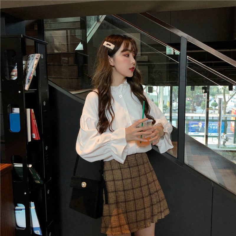 トップス ブラウス 白シャツ 袖あり 長袖 ボリューム袖 萌袖 ハイネック スリム タイト 細身 フリル ポリエステル かわいい 大人可愛い きれいめ シンプル カジュアル 大人 上品 おしゃれ お洒落 大人可愛い 大人女子 こなれ感 ラフ メンズライク ラブリー キュート ガーリー 無地 春 秋 冬 10代 20代 30代 レディース 女性用 オフィス OL 通勤 学生 通学 デート お出かけ 公園デビュー 女子会 お泊まり 休日 着回し 普段使い 重ね着 韓国 韓国系 オルチャン ファッション