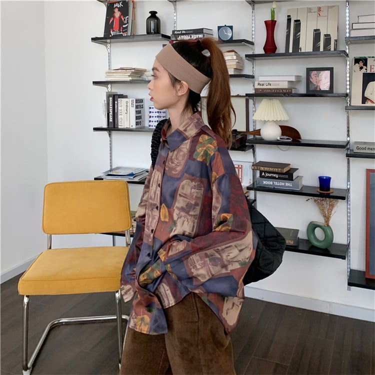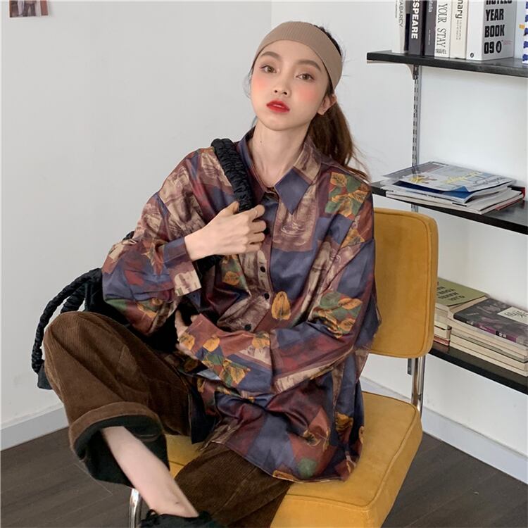 レトロ風 トップス シャツ 袖あり 長袖 ボリューム袖 萌袖 襟付き 大人可愛い カジュアル 大人 おしゃれ お洒落 かっこいい レトロ アジアン エキゾチック メンズライク ボーイッシュ 個性的 クール 主役級 存在感 とろみ感 抜け感 柄 春 秋 学生 通学 お出かけ 女子会 旅行 普段使い 楽ちん インスタ映え 大きめ ビッグサイズ ゆったり
