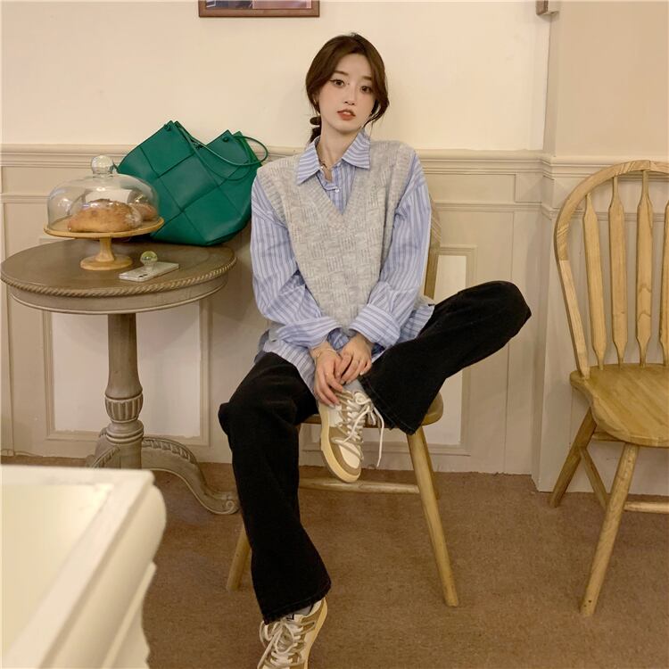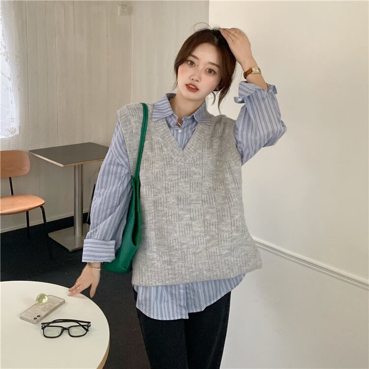 メンズライクなニットベストとシャツのセット