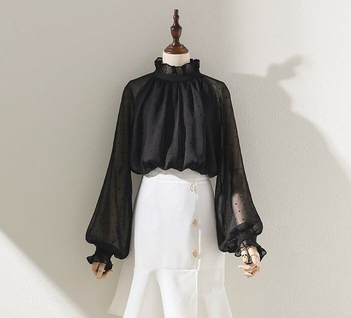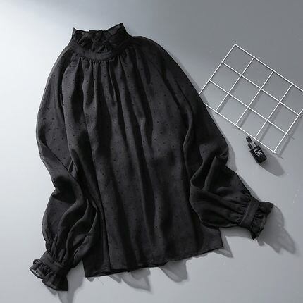 トップス ブラウス 袖あり 長袖 襟付き スタンドカラー シフォン 透け感 シースルー 薄手 かわいい 大人可愛い きれいめ 大人 上品 おしゃれ お洒落 大人可愛い 大人女子 ラブリー キュート ガーリー エレガント とろみ感 抜け感 水玉 10代 20代 30代 40代 学生 通学 デート お出かけ 女子会 旅行 普段使い お揃い モテ S M L 黒 ブラック