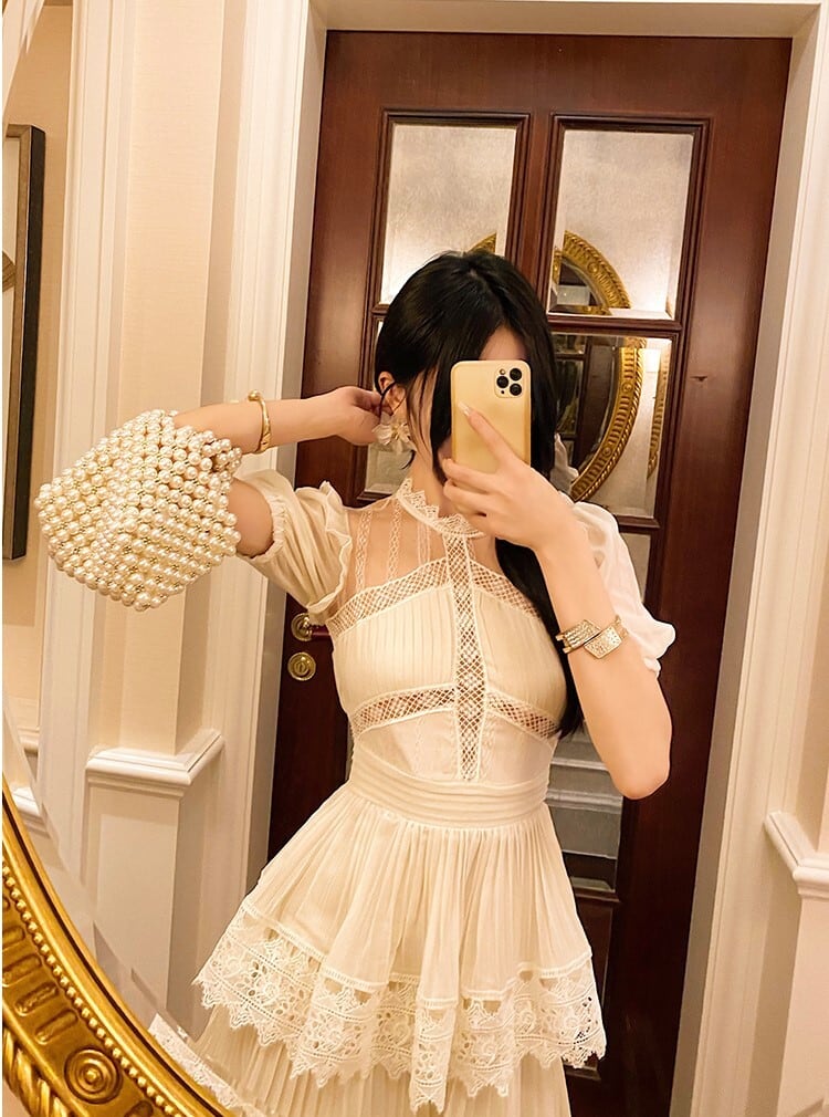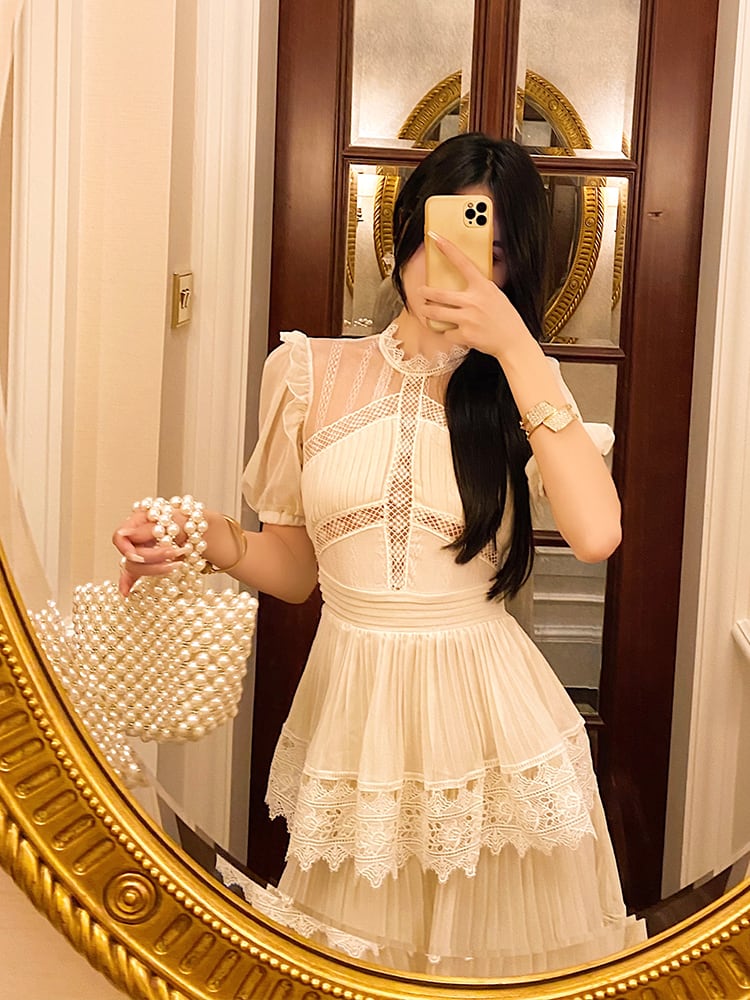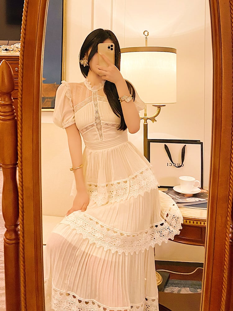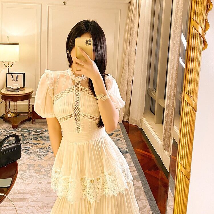 ワンピース ロングスカート ティアードワンピース 膝下 ロング ロング丈 半袖 ラウンドネック スタンドカラー レース シフォン フリル 透け感 かわいい ラブリー キュート ガーリー 個性的 エレガント 主役級 存在感 とろみ感 パーティー イベント 高原 ガーデン モテ