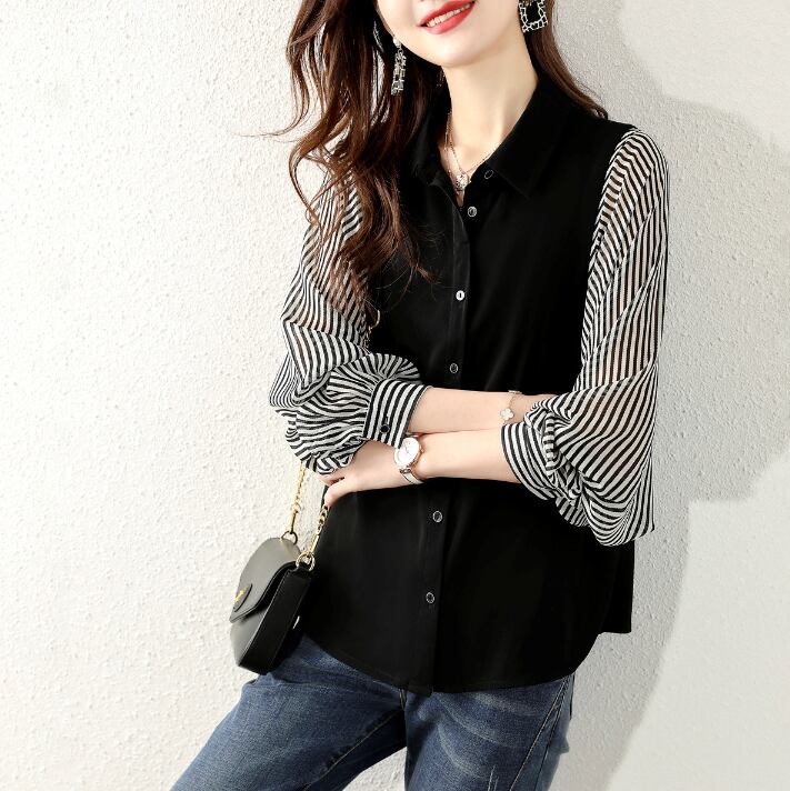 トップス シャツ 長袖 ボリューム袖 襟付き カジュアル レトロ ストライプ 秋 20代 レディース 通勤 お出かけ M L XL 2XL 黒