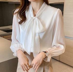 トップス ブラウス 白シャツ 長袖 Vネック 襟付き ストレート リボン 大人 上品 フォーマル 無地 秋 20代 レディース オフィス お出かけ S M L XL 2XL 白