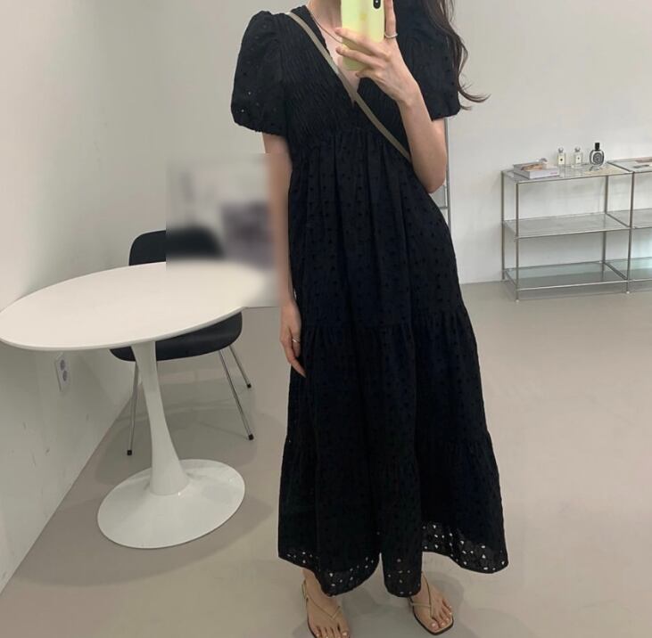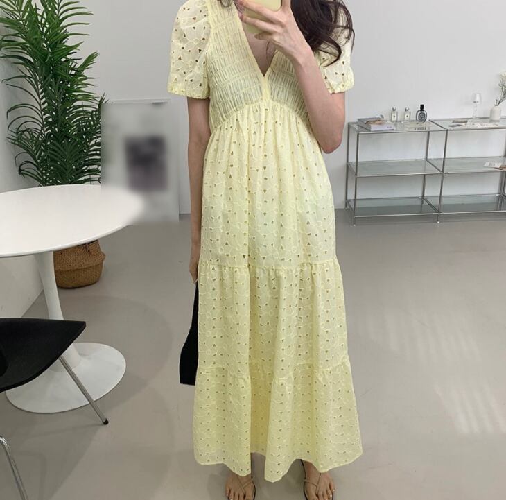 ワンピース フレアワンピース ロング丈 半袖 パフ袖 Vネック フレア Aライン ハイウエスト 透け感 大人 おしゃれ セクシー 夏 10代 20代 レディース デート お出かけ レストラン ワンサイズ 白 黒 緑 黄色