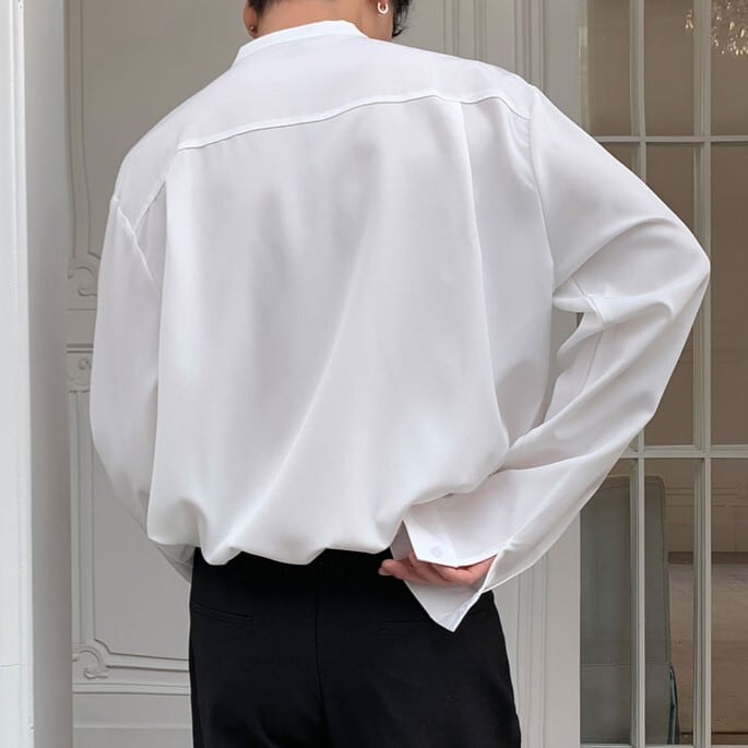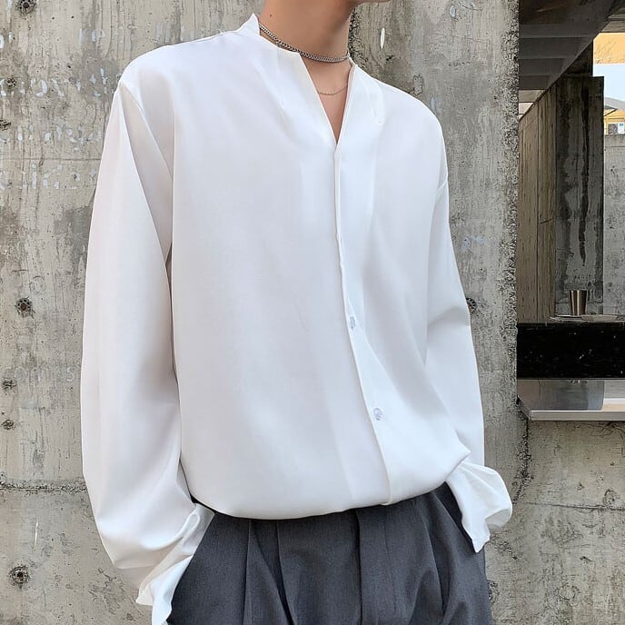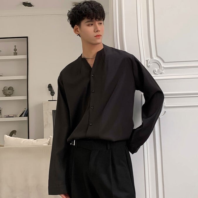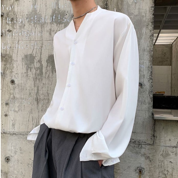 トップス シャツ 袖あり 長袖 Vネック 襟なし 前開き きれいめ シンプル カジュアル 大人 上品 おしゃれ お洒落 かっこいい こなれ感 ラフ メンズライク マニッシュ ボーイッシュ モード系 モダン 無地 レディース メンズ 通勤 学生 通学 デート お出かけ 休日 旅行 着回し 普段使い 白 ホワイト 黒 ブラック カーキ
