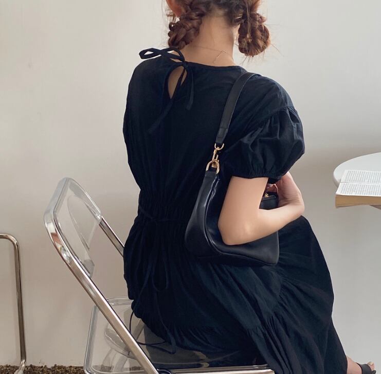 ドレス ワンピース パーティードレス 二次会ドレス ロングドレス ロング丈 パフ袖 ラウンドネック Aライン ハイウエスト 胸元 大人 お洒落 セクシー レトロ 20代 30代 レディース パーティー イベント 夏 ワンサイズ 黒 青 ピンク