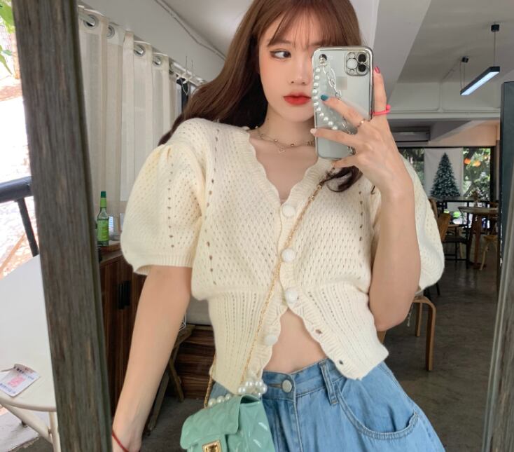 トップス セーター 半袖 ボリューム袖 パフ袖 Vネック ニット かわいい カジュアル おしゃれ 夏 10代 20代 レディース デート お出かけ ワンサイズ 白 ピンク