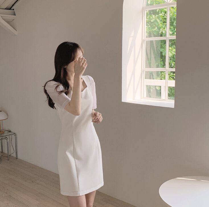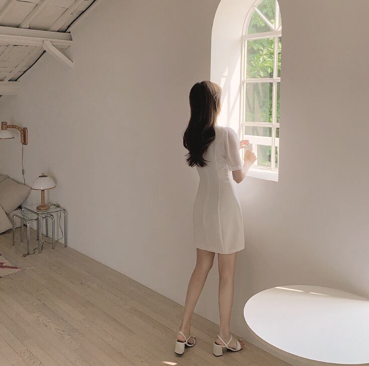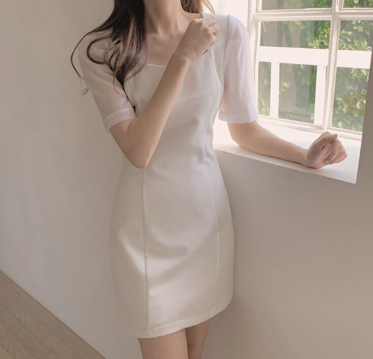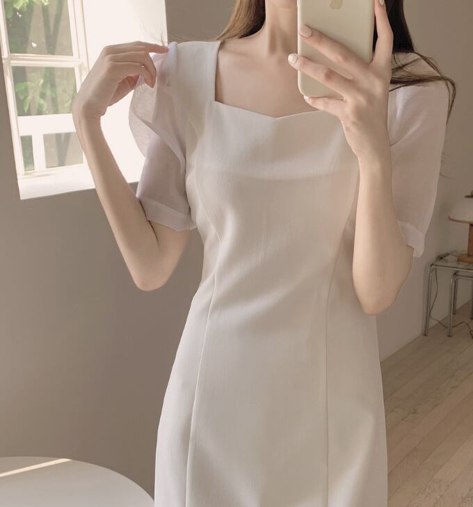 ワンピース ワンピドレス 膝下 パフ袖 スクエアネック Aライン きれいめ 大人 上品 夏 20代 レディース デート お出かけ 美脚 S M L XL 白