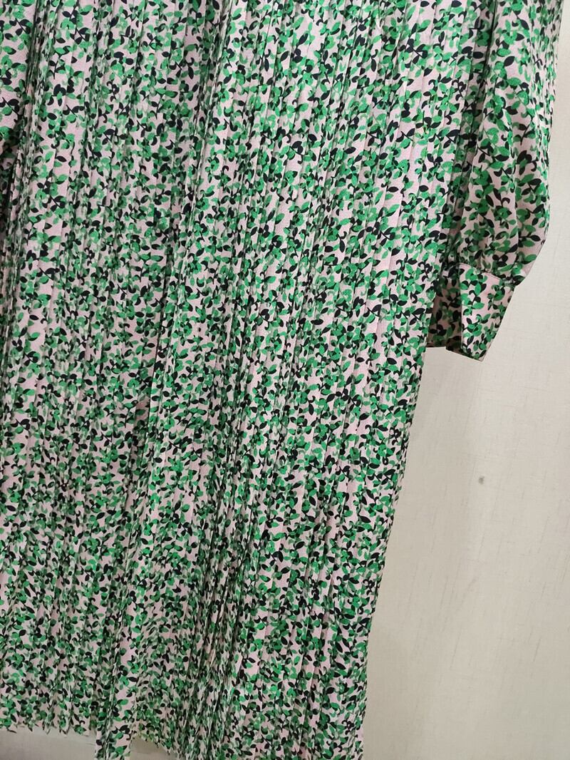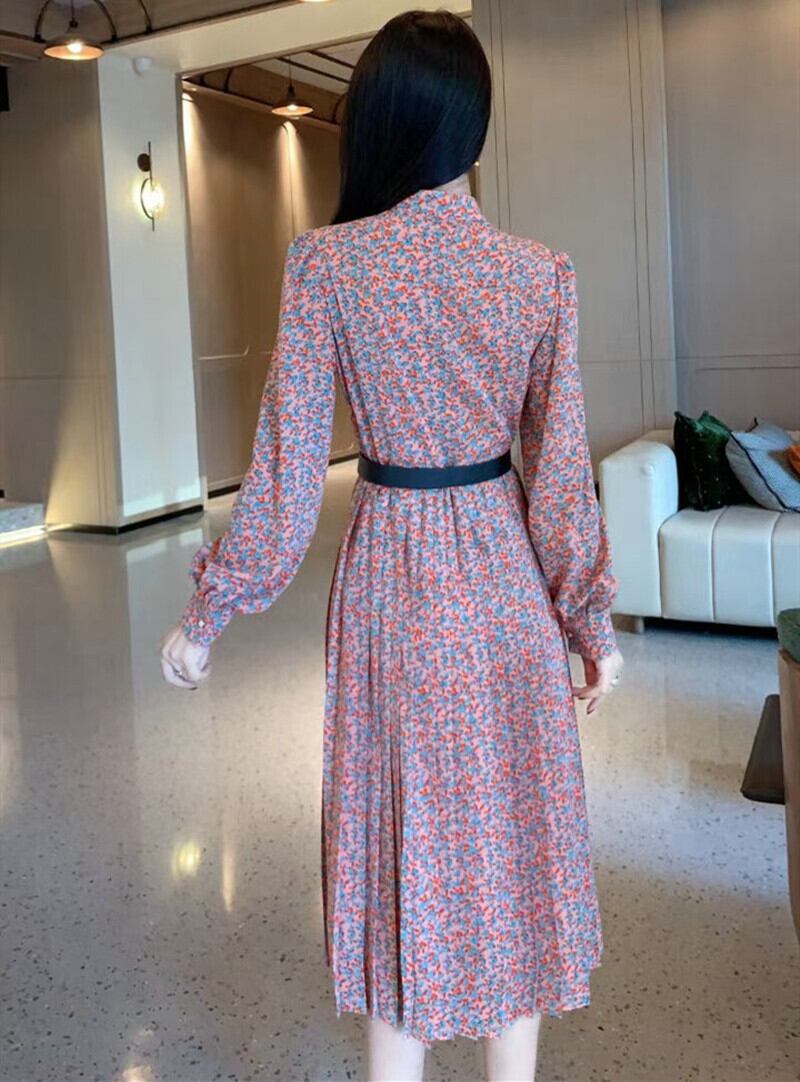 ワンピース プリーツスカート 膝下 ミモレ 袖あり 長袖 スタンドカラー Aライン プリーツ パール ポリエステル かわいい 大人可愛い きれいめ シンプル 大人 上品 おしゃれ お洒落 レトロ 大人女子 ラブリー ガーリー エレガント 主役級 存在感 小花柄 春 夏 10代 20代 30代 レディース オフィス OL 通勤 学生 通学 デート お出かけ イベント 旅行 S M L XL 赤 レッド 緑 グリーン