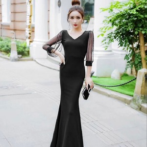 ワンピース ロング丈 袖あり 7分袖 Vネック スリム タイト マーメイド ハイウエスト 大人可愛い きれいめ シンプル 大人 上品 おしゃれ 大人女子 個性的 クール セクシー エレガント 無地 春 夏 秋 結婚式 二次会 10代 20代 レディース 女性用 女子会 お泊まり 休日 リゾート 旅行 ホテル ガーデン レストラン ファッション スタイル インスタ映え サイズ S M L XL 2XL 色展開 ブラック グリーン ネイビー