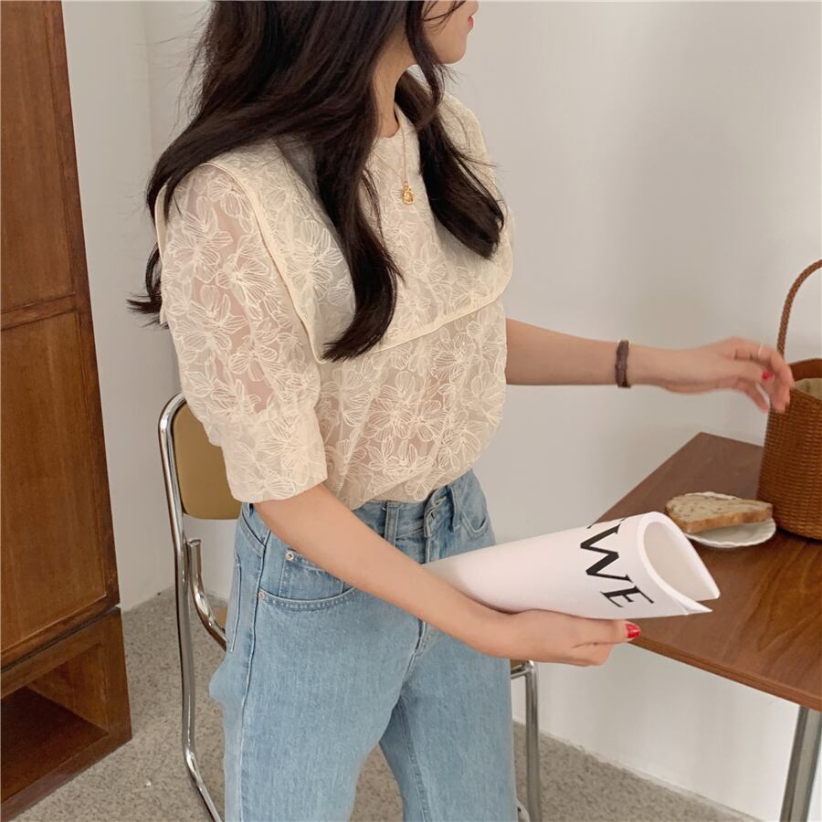 トップス ブラウス 袖あり 5分袖 ボリューム袖 パフスリーブ バルーンスリーブ セーラーカラー レース 刺繍 透け感 シースルー かわいい 大人可愛い 大人 上品 おしゃれ お洒落 レトロ 大人可愛い 大人女子 こなれ感 抜け感 花柄 春 夏 レディース 女性用 学生 通学 デート お出かけ 女子会 休日 旅行 ホテル レストラン 着回し 普段使い ワンサイズ