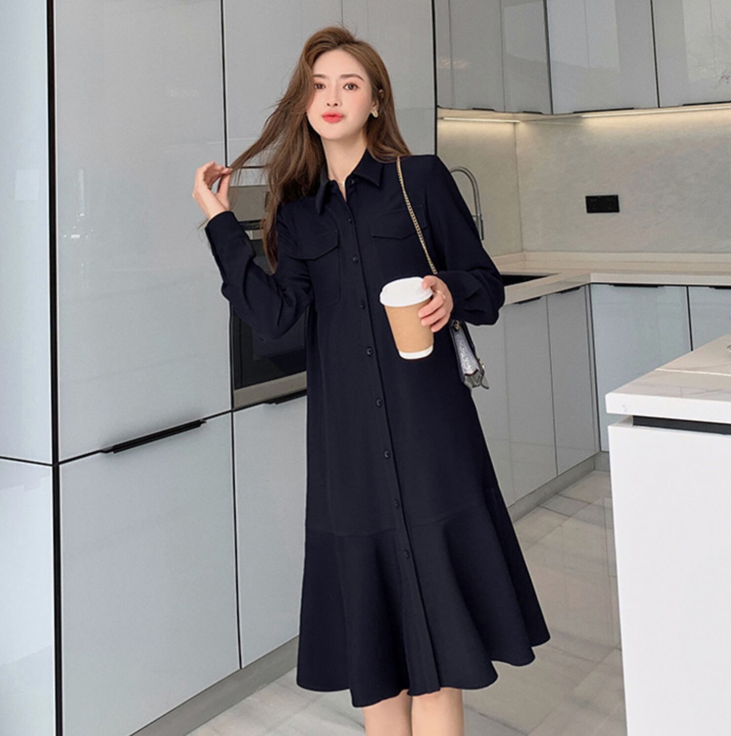 ワンピース 膝丈 ひざ丈 袖あり 長袖 襟付き シャツ襟 セミフレア Aライン ポケット 前開き 前ボタン コーデュロイ かわいい 大人可愛い シンプル 大人 おしゃれ お洒落 大人可愛い 大人女子 キュート 無地 秋 冬 レディース 女性用 学生 通学 デート お出かけ 女子会 休日 ホテル レストラン 普段使い L XL 2XL 3XL ブラック