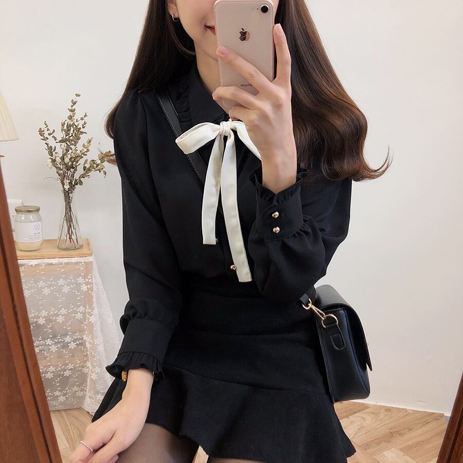 トップス ブラウス 袖あり 長袖 襟付き シャツ襟 丸襟 フリル リボン 前開き 前ボタン かわいい 大人可愛い きれいめ 大人 おしゃれ お洒落 大人可愛い 大人女子 ガーリー 無地 春 秋 レディース 女性用 通勤 学生 通学 デート お出かけ 女子会 休日 旅行 ホテル レストラン 着回し 普段使い S M L XL ブラック ホワイト