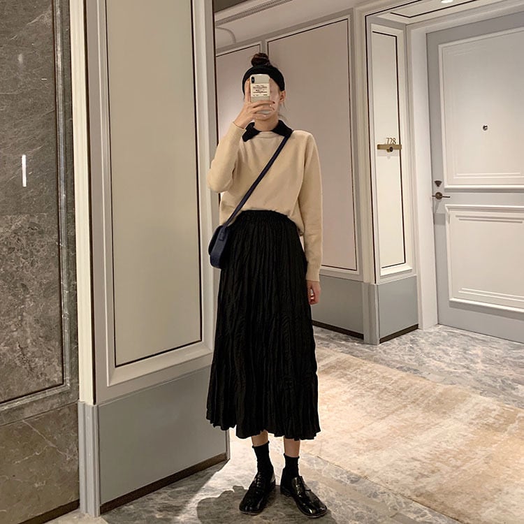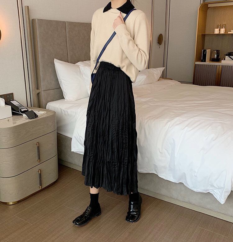 スカート ミモレ丈 セミフレア ウエストゴム 伸縮性 シワ加工 かわいい 大人可愛い 大人 おしゃれ お洒落 大人可愛い 大人女子 こなれ感 存在感 無地 秋 冬 レディース 女性用 学生 通学 デート お出かけ 女子会 休日 旅行 ホテル レストラン 着回し 普段使い 2XL ワンサイズ