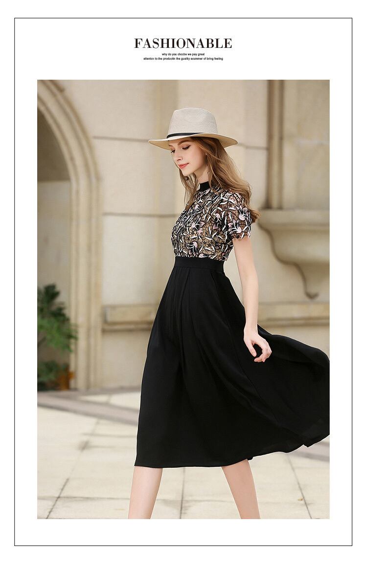 ドッキングワンピース 花柄レース パーティ 結婚式 ロング 半袖 クルーネック フレア 異素材ミックス レース柄 ワンピース 春夏秋