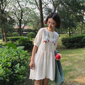 裾アンバランス ハイウエスト 花刺繍 かわいい ガーリー ショート 半袖 クルーネック Aライン 花柄 ワンピース 春夏秋