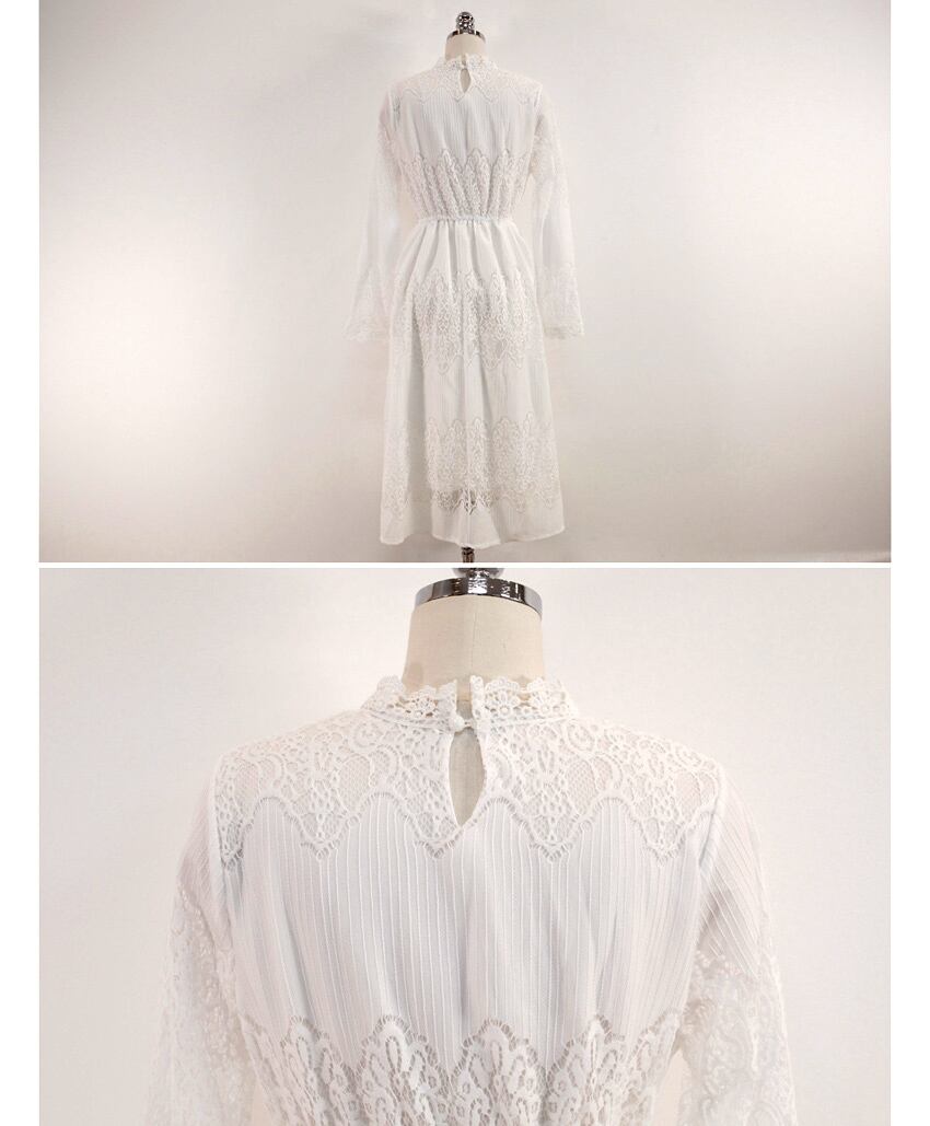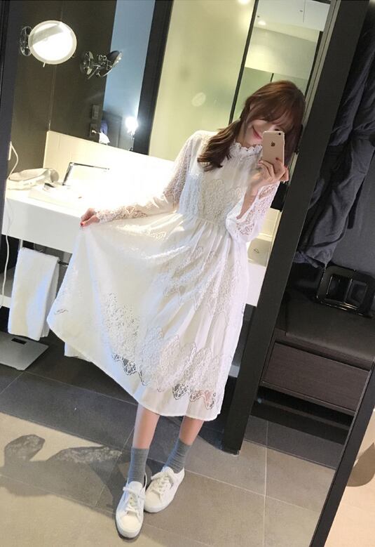 花柄 フラワー ガーリー Aライン ロング 長袖 ラウンドネック マキシ ミモレ丈 レース柄 ワンピース 春夏秋