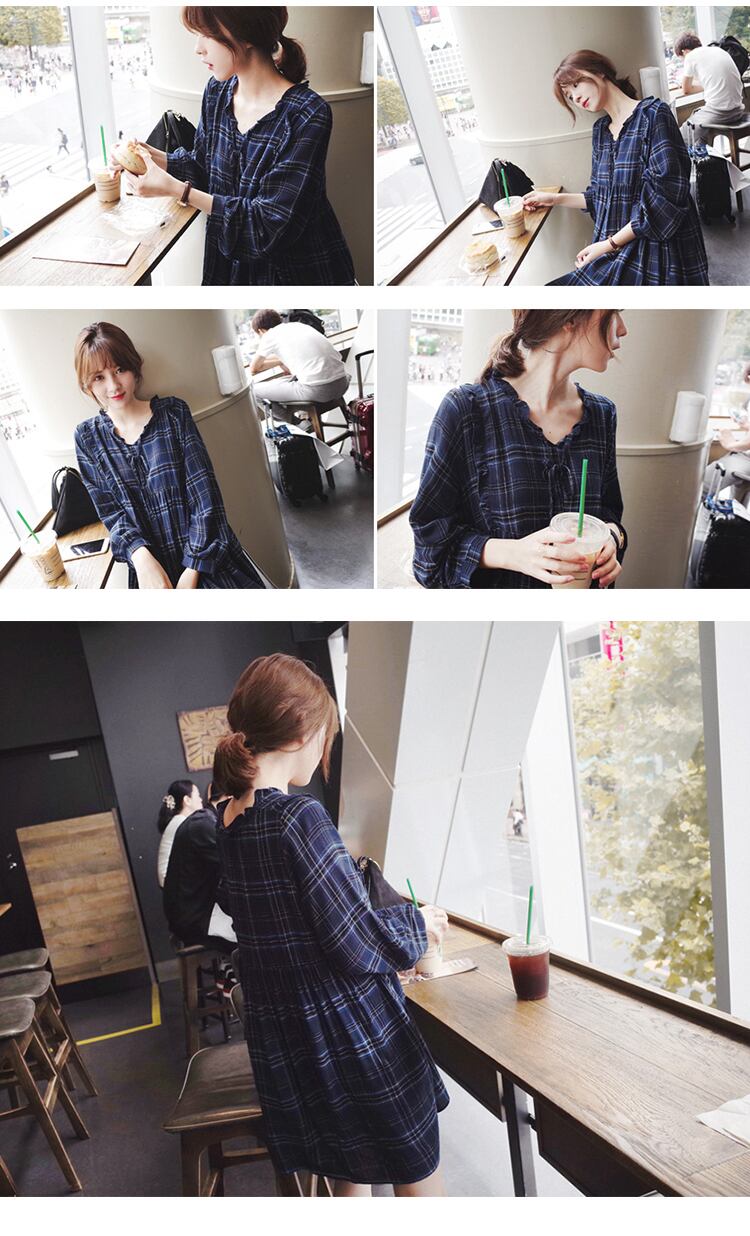 チェック かわいい ガーリー リボン ショート 長袖 Vネック Aライン タータンチェック ワンピース 秋冬春 FKOM5255
