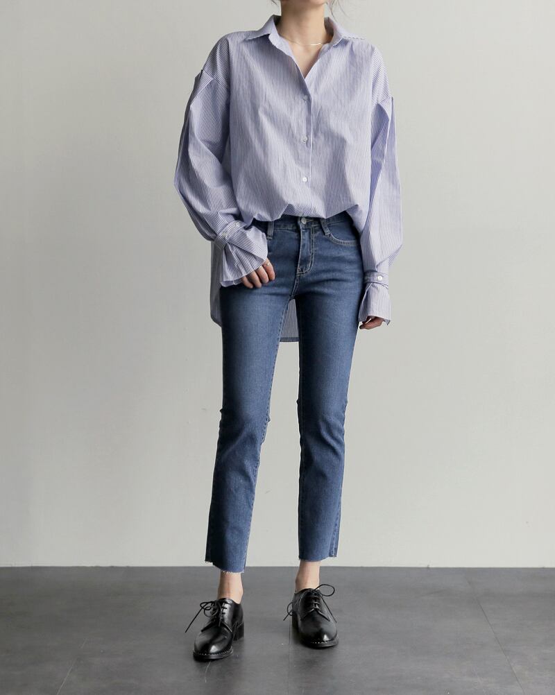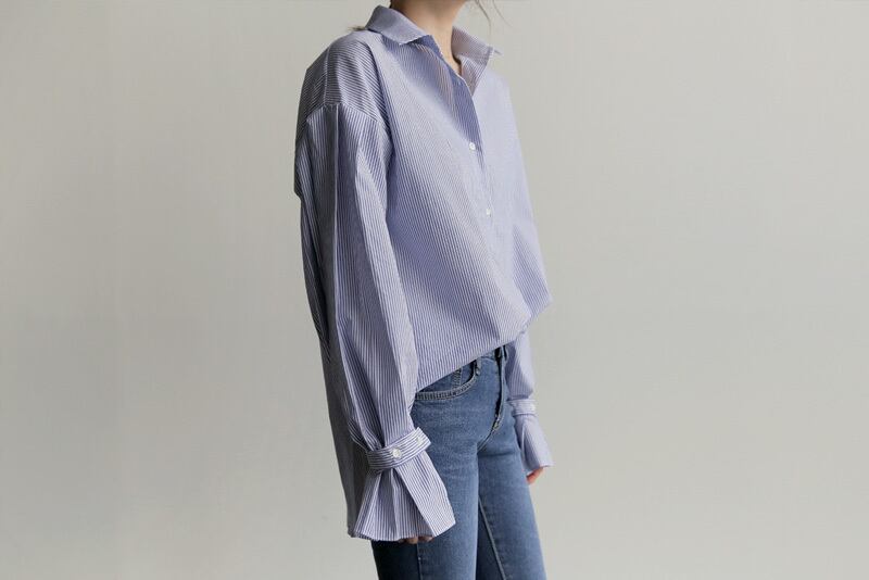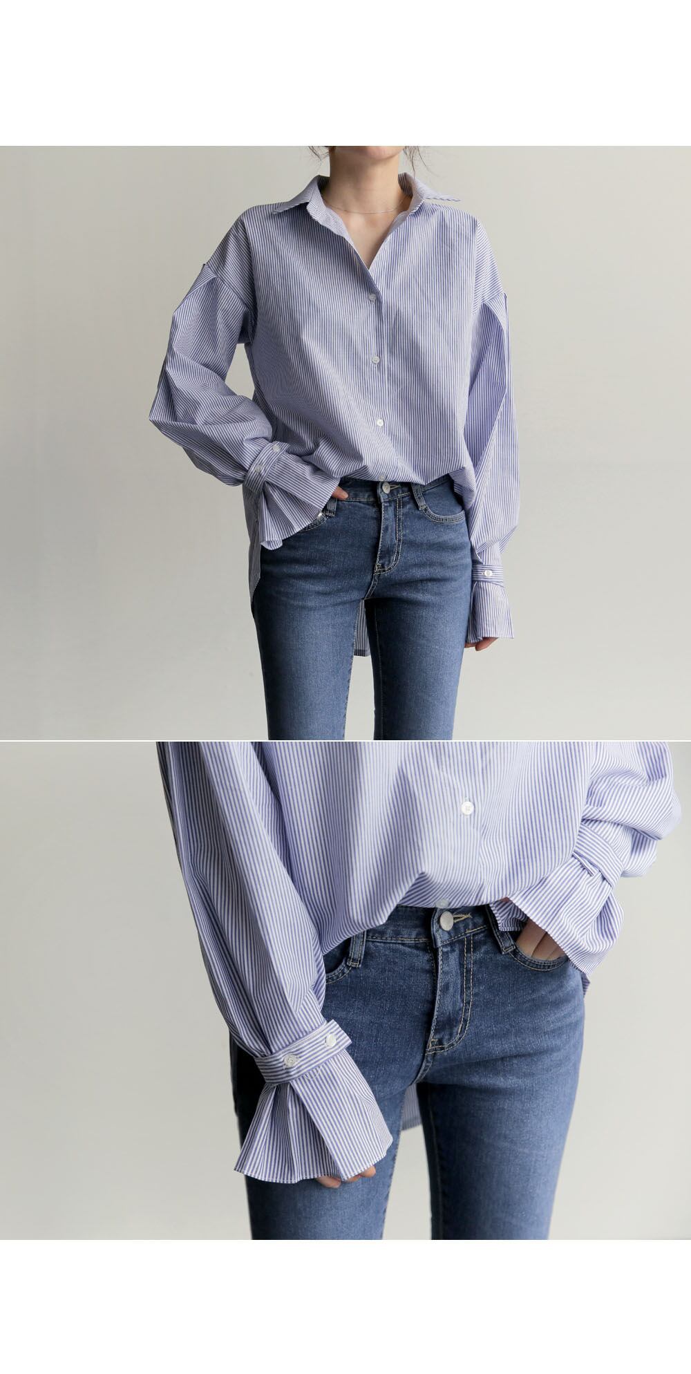 袖フリル 袖フレア オフィスカジュアル オフィスコーデ 体系カバー ロング 長袖 襟付き 袖コンシャス ストライプ トップス