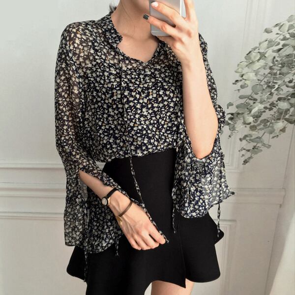 リボン シースルー 袖フリル 袖フレア ガーリー ミディアム 長袖 ノーカラー 袖コンシャス 花柄 トップス